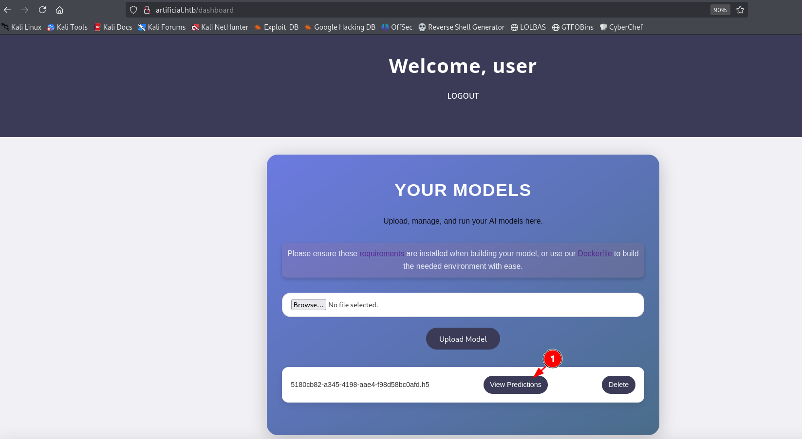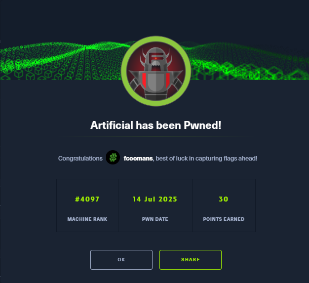 The artificial.htb web application was vulnerable to CVE-2024-3660 in TensorFlow Keras. By uploading a crafted AI model, I triggered the flaw and achieved remote code execution, landing a reverse shell as the app user.