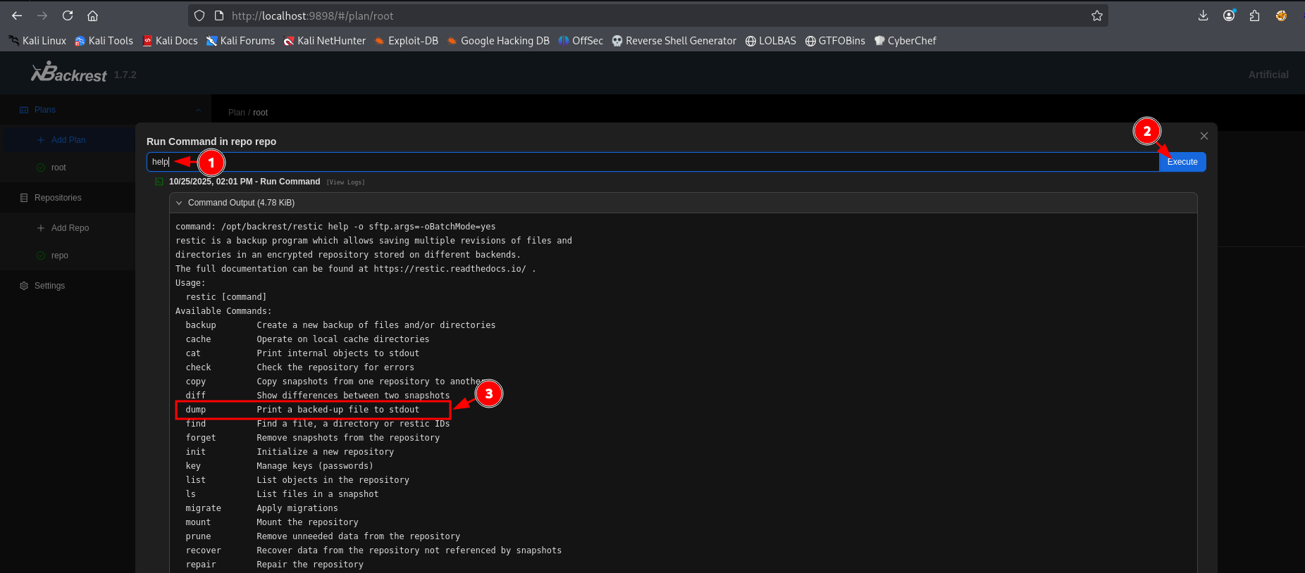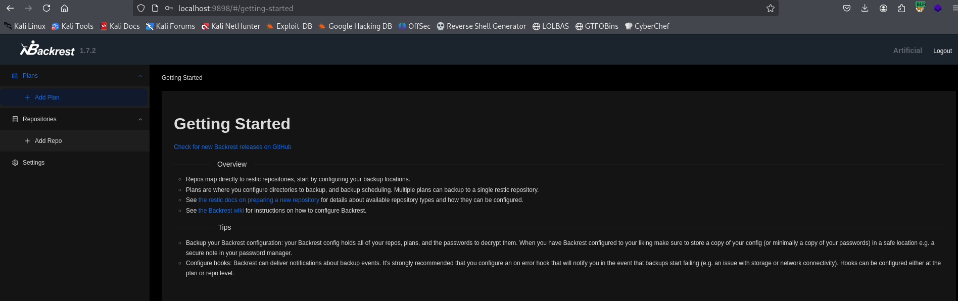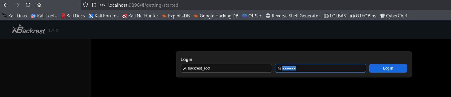 I opened the site on the attack host and used the username backrest_root and password !@#$%^ to log into the backrest app.