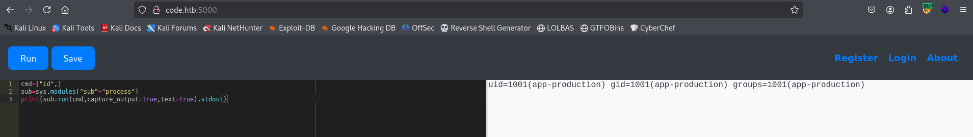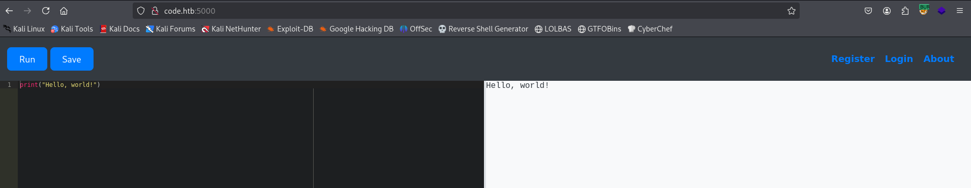 I open the site at http://code.htb:5000 and find the Python Code Editor web application. You can enter Python code in the left panel, and the code is executed when the Run button is clicked, and the output is displayed in the right panel.