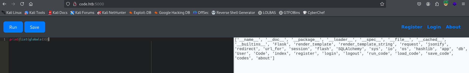 ['__name__', '__doc__', '__package__', '__loader__', '__spec__', '__file__', '__cached__', '__builtins__', 'Flask', 'render_template', 'render_template_string', 'request', 'jsonify', 'redirect', 'url_for', 'session', 'flash', 'SQLAlchemy', 'sys', 'io', 'os', 'hashlib', 'app', 'db', 'User', 'Code', 'index', 'register', 'login', 'logout', 'run_code', 'load_code', 'save_code', 'codes', 'about']