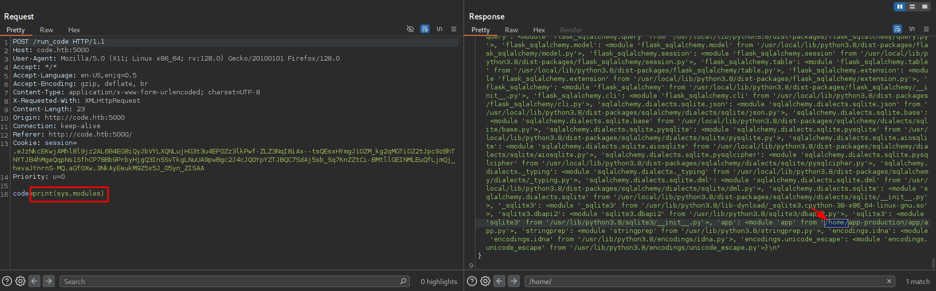 Printing the sys.modules in BURP shows all the available modules. The application is also listed under /home/app-production/app/app.py.