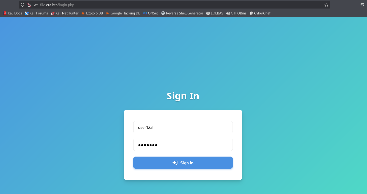 The site is redirected to http://file.era.htb/login.php after successful registration. I login with the newly registered account.