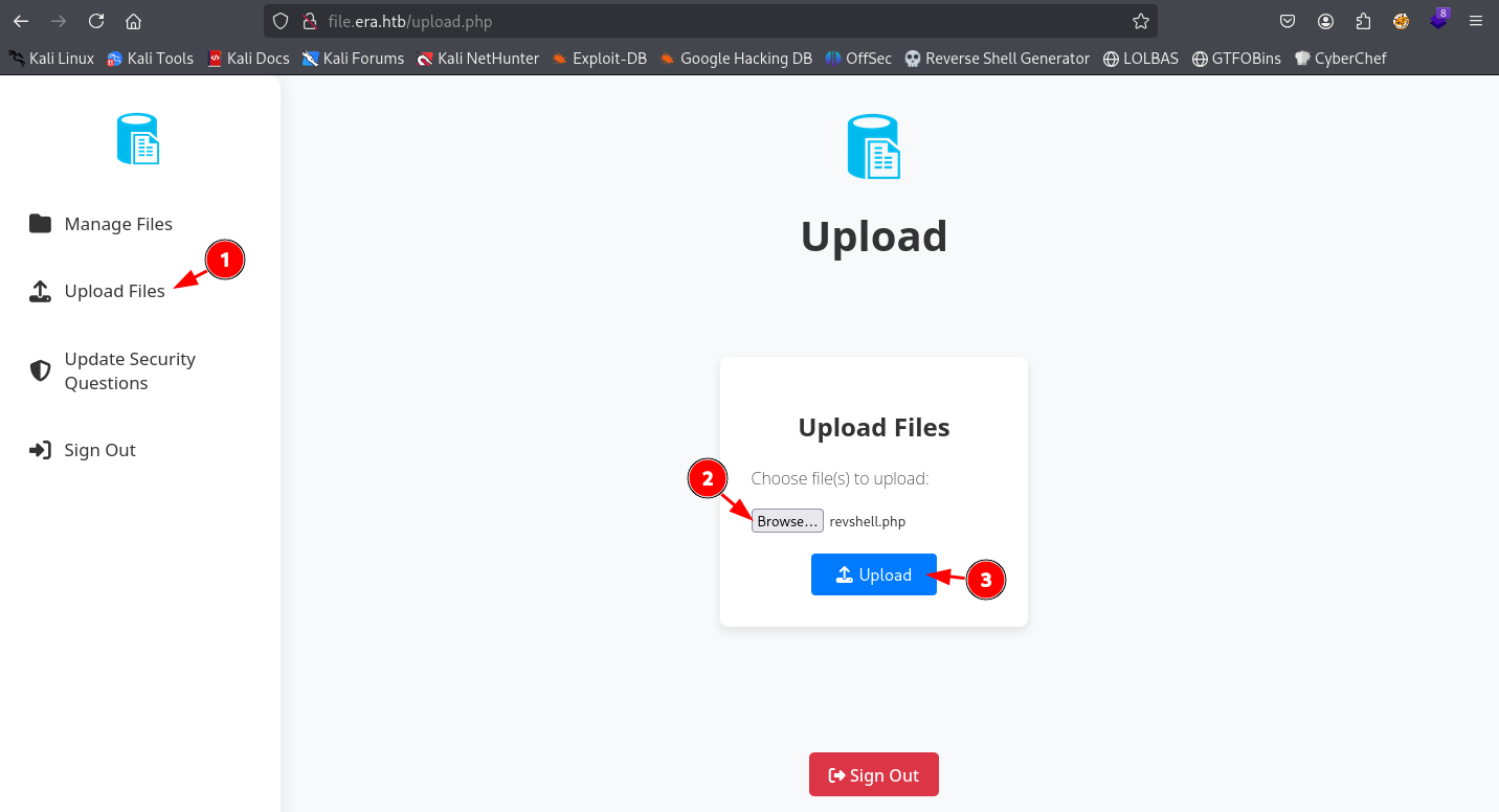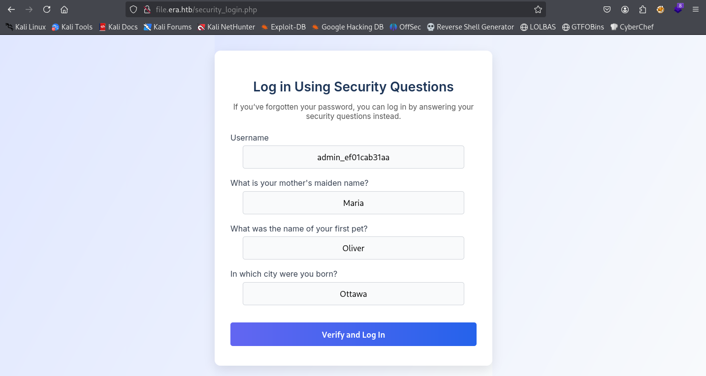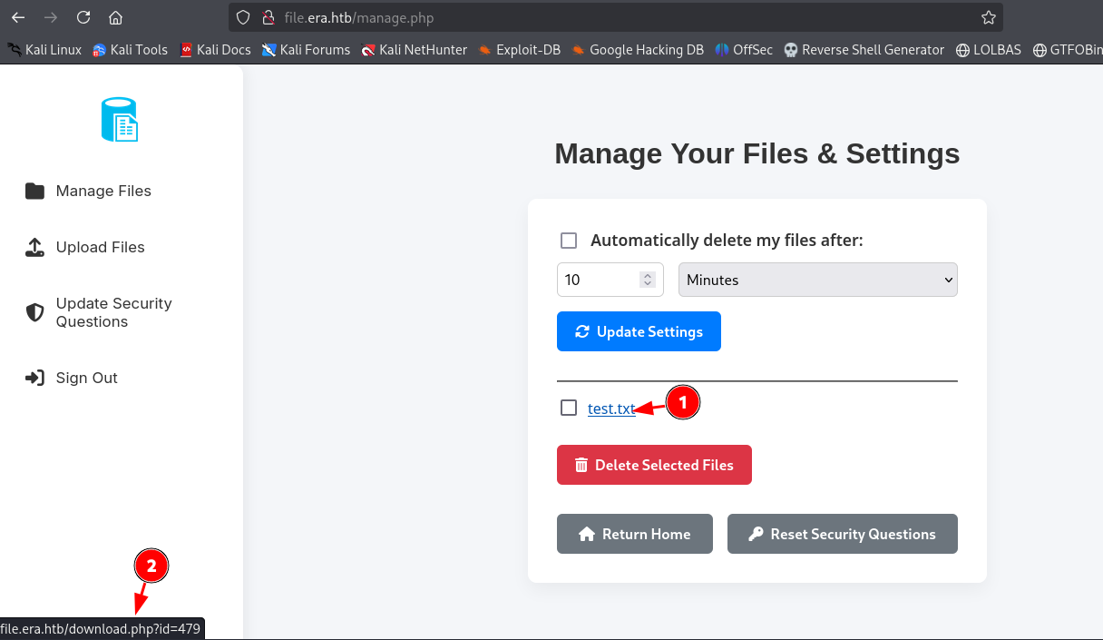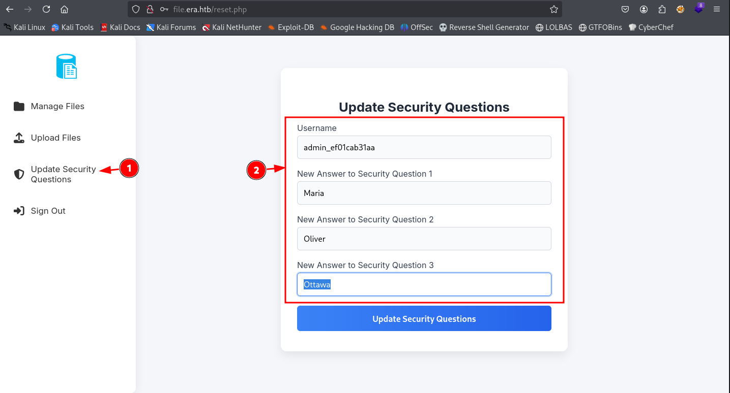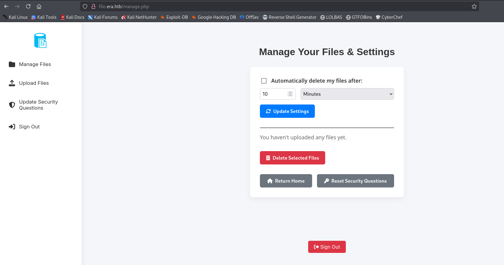And am greeted by the file store dashboard, http://file.era.htb/manage.php. Here files can be uploaded, downloaded, deleted and security questions (for login with security questions) can be updated.