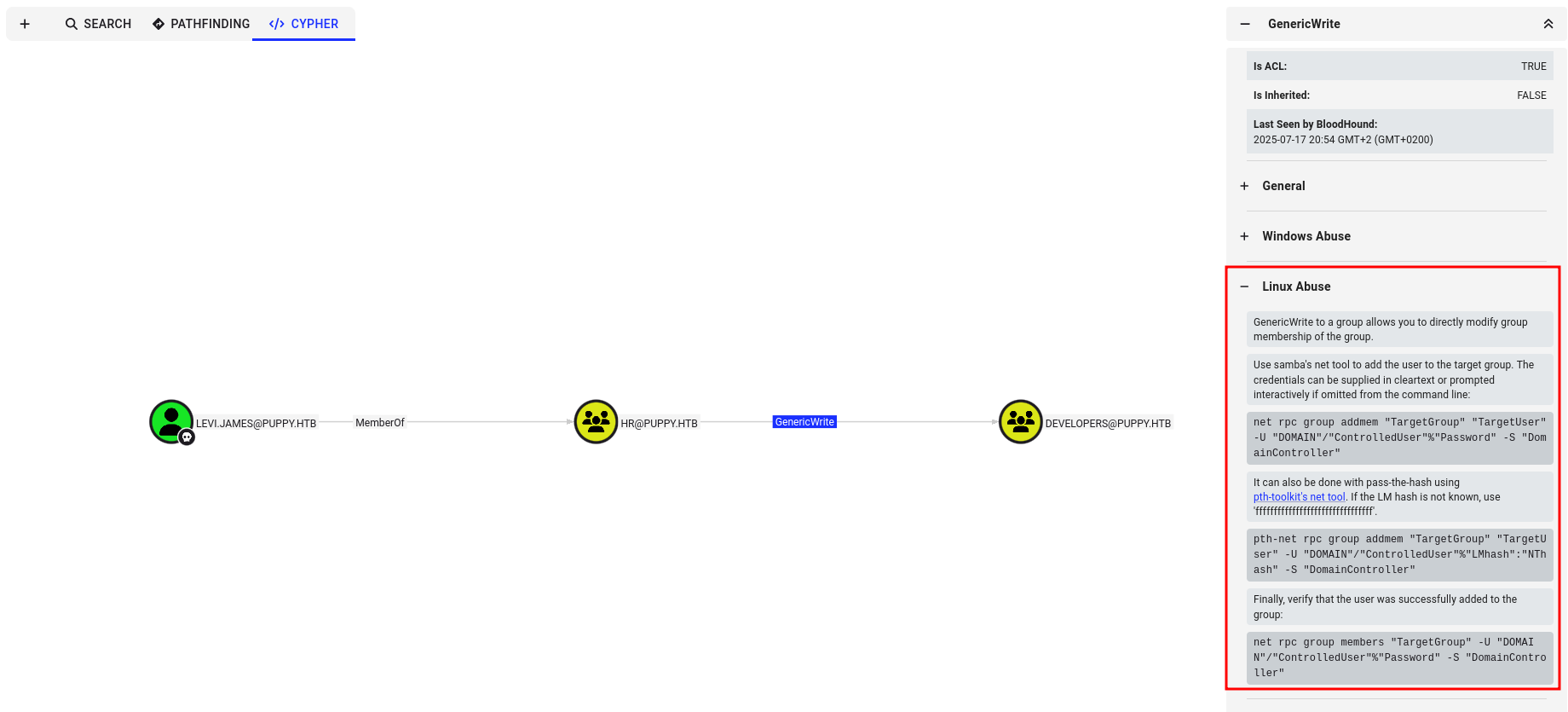 Using the supplied engagement credentials, I ran a BloodHound collector against the target Active Directory domain. A BloodHound query revealed an attack path: the user Levi could add himself to the DEVELOPERS group, which granted access to the DEV file share.