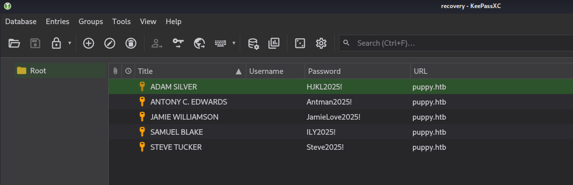 On DEV, Levi discovered a KeePassXC vault. I extracted the vault and brute-forced the master password. The vault revealed several passwords.