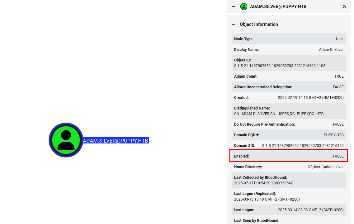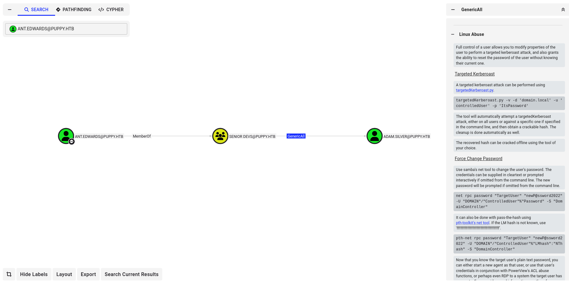 With those passwords, I brute-forced domain users and recovered credentials for Ant Edwards. Ant was able to re-enable a disabled account for Adam Silver and reset Adam’s password — giving me WinRM access to the server as Adam.