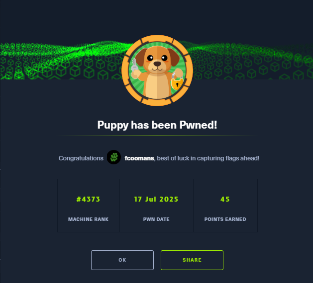 fcoomans@kali:~/htb/puppy/loot/puppy$ nxc ldap dc.puppy.htb -u steph.cooper -p ChefSteph2025!
