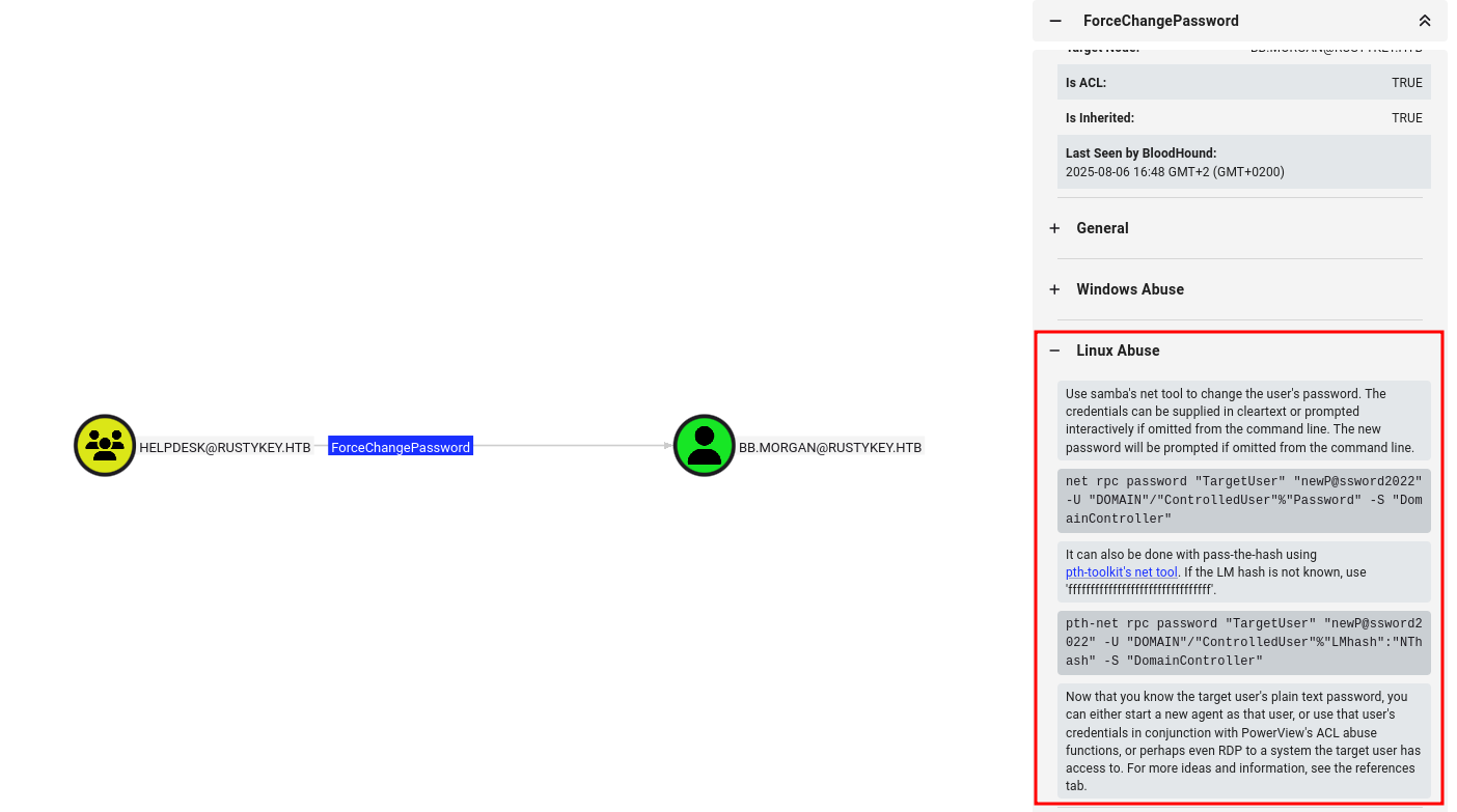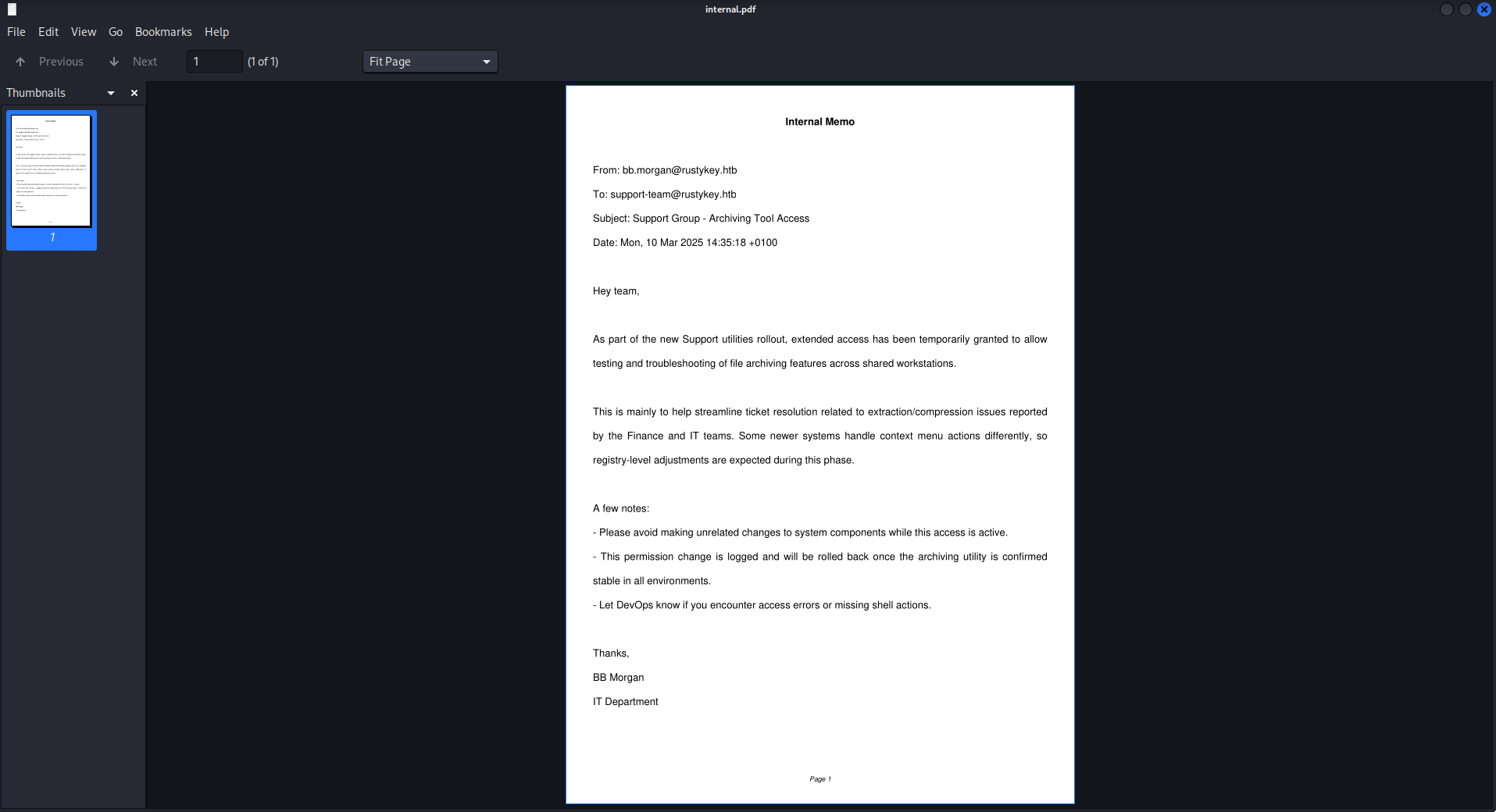 Next, Access Control Entry (ACE) abuse enabled privilege escalation to user bb.morgan, along with Remote Management access to dc.rustykey.htb. On bb.morganโs Desktop, I found a revealing memo noting that the Support group had been granted extra permissions to modify the context menu of an archiving tool.