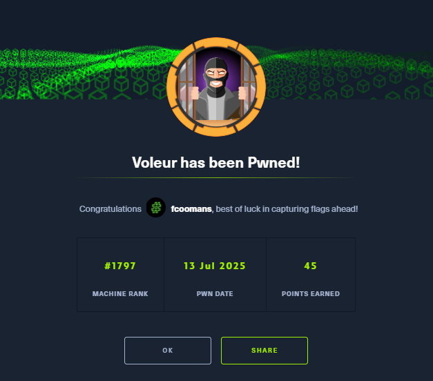 As is common in real life Windows pentests, you will start the Voleur box with credentials for the following account: ryan.naylor / HollowOct31Nyt