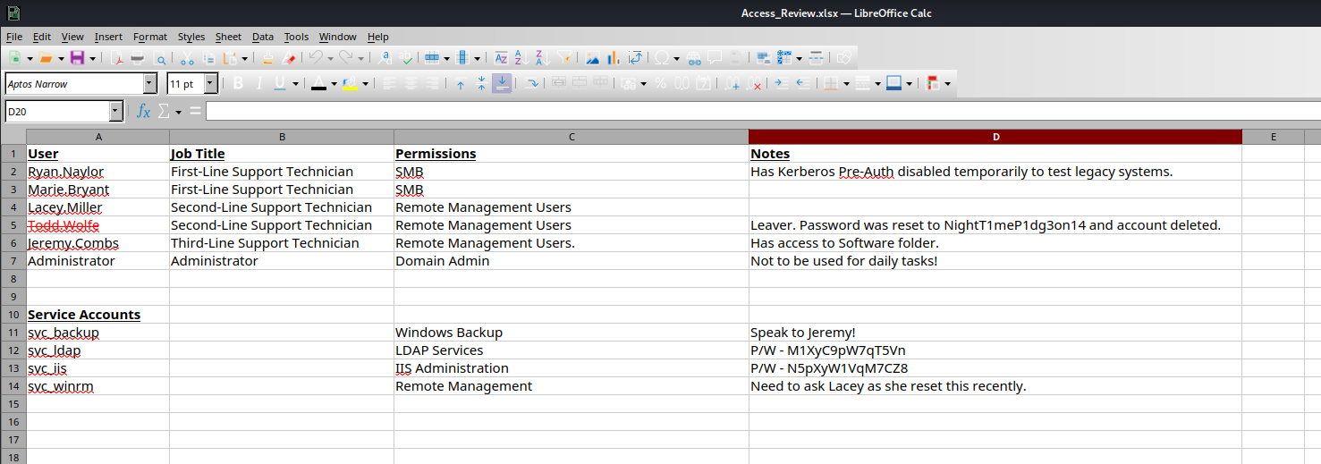 The chain started with read access to an IT share. That share contained a password-protected Excel workbook holding account names and passwords — I cracked the workbook password with hashcat and pulled out credentials for svc_ldap. Those svc_ldap credentials allowed a targeted Kerberoast against svc_winrm, which exposed a service account usable for remote management on the server.
